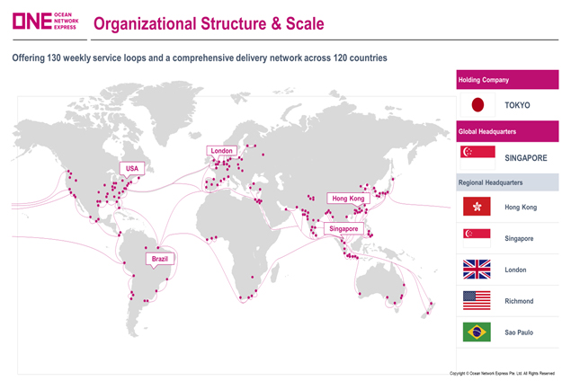 OCEAN NETWORK EXPRESS connu comme ONE est le fruit de la Fusion des trois Armateurs du Japon NYK (Nippon Yusen Kaisha) (participation de 38%), MOL (Mitsui O.S.K. Lines) (31%) et K Line (Kawasaki Kisen Kaisha) (31%). Elle a officiellement vu le jour le 7 juillet 2017. La société a débuté ses activités sous le nom «Ocean Network Express» à compter du 1er avril 2018, avec un siège social à Tokyo, un siège mondial à Singapour et un siège régional au Royaume-Uni (Londres), aux États-Unis (Richmond, VA), Hong Kong et au Brésil (Sao Paulo). Les slogans de la société sont “As ONE, we can” (comme UN, nous pouvons), “All routes lead to ONE” (Tous les itinéraires mènent à UN) et “We are ONE” (Nous sommes UN). Celles-ci sont clairement liées au fait que la société est issue de trois entités différentes, qui ont été fusionnées dans une nouvelle organisation unique.